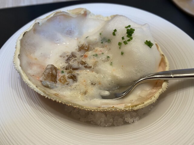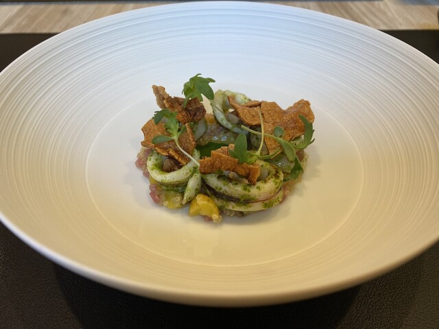 ⑦ヤリイカのパセリバターソース、キヌアや銀杏ヤリイカのせんべい入り