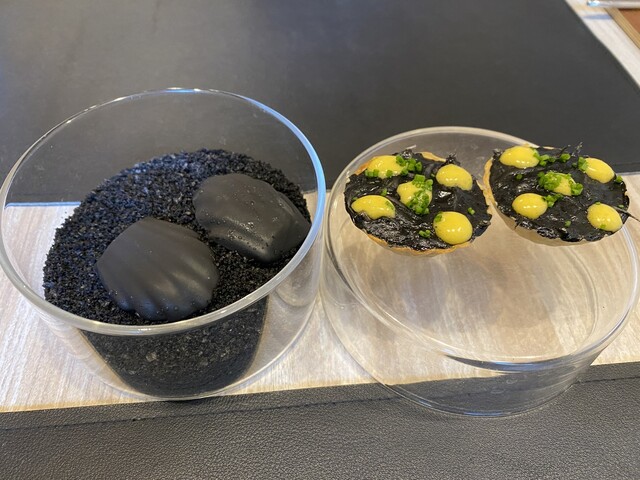 ③シラス入りイカ墨のタルトとブラックオリーブのソース入りマドレーヌ