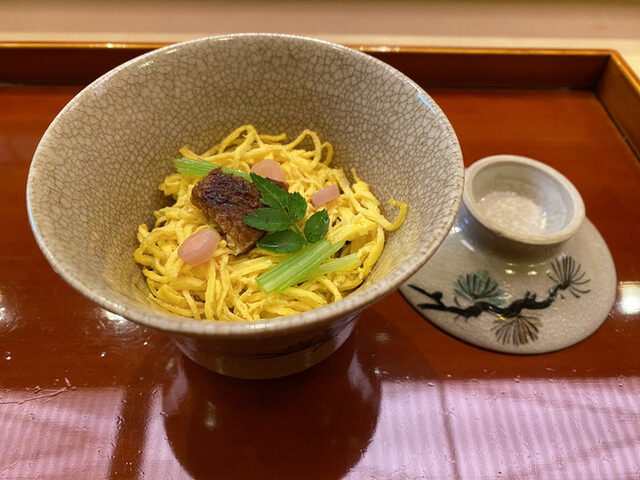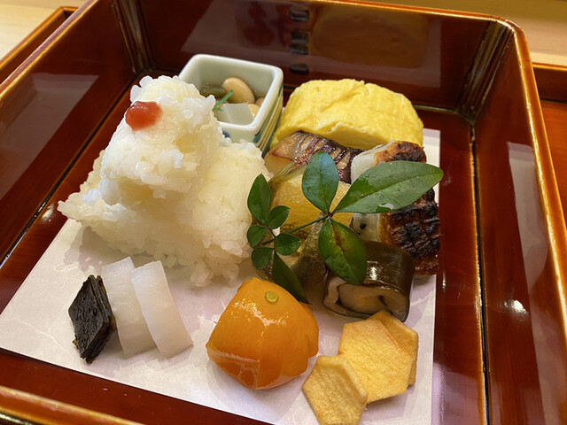 八寸は右回りにだし巻き卵、マナ鰹の幽庵焼き、胡麻ふの田楽、子持ち昆布、鯛の昆布巻き、もろこ、クワイのチップス、キンカン、香の物、百合根の炊き込みご飯、福豆