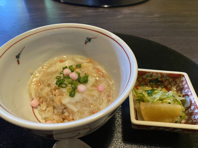 太刀魚、山菜、海老の真薯のぶぶ揚げ、ホタテ包み揚げの揚げ物盛り合わせ