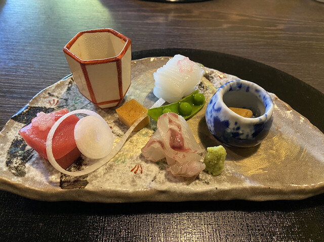 刺身も新鮮で見た目も華やか、マグロ、紋甲烏賊と平目とエンガワ、細かな細工が素晴らしい