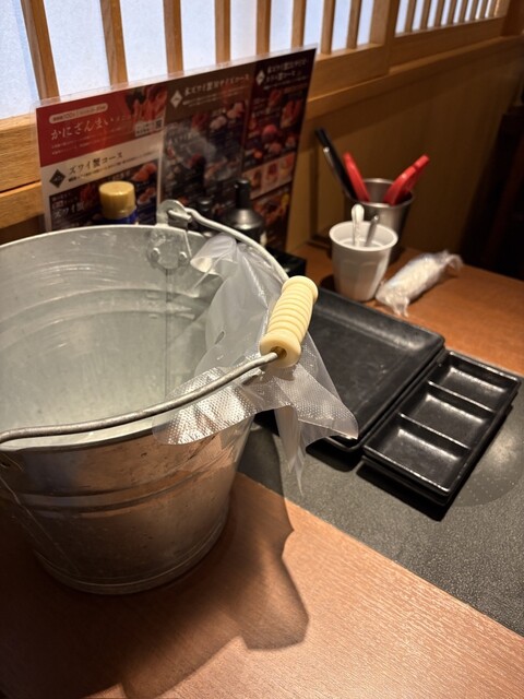 年末なので奮発して本ズワイ蟹2Lサイズの食べ放題9980円 席にバケツが置いてあり驚きました。