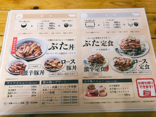 お店に入る前は完全に豚丼のイメージでしたが、着席しメニューを眺めるとしばらく来ていない間にまたメニューが刷新されていて、今まで見たことのないバラ肉定食が!!