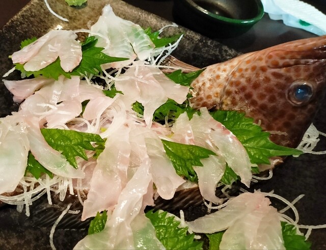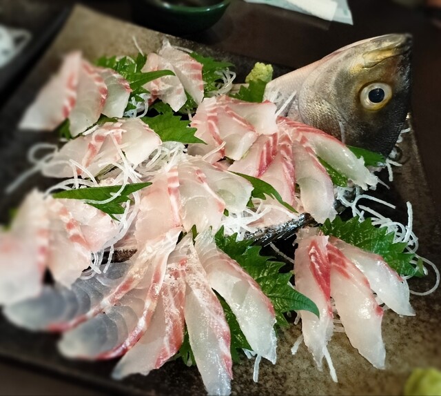 はじめにでてきた、刺身のお皿3枚で気持ちも上がります。白身が中心ですがどれも新鮮で美味しいです。甘めのしょう油が刺身に絡んでいい感じです。