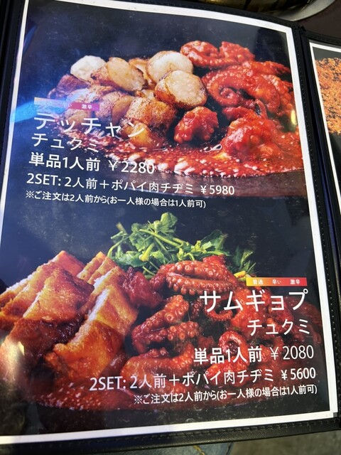 今回は、サムギョプサルチュクミ2人前を注文。私は何度かお店に行ったことがあるのですが、初めてチュクミを食べたお友だちは感激していました。何度か対応してくれた店員さんは、アフリカ大陸?出身の外国人なのに、手際よく調理して下さいました。