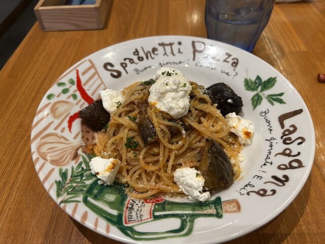 ランチには、パスタ、ピザ、リゾットのメニューがあり、彩りサラダが付いています。今日は、茄子とリコッタチーズのミートソースパスタ(1,760円)に、ホットコーヒー☕️(220円)を追加。