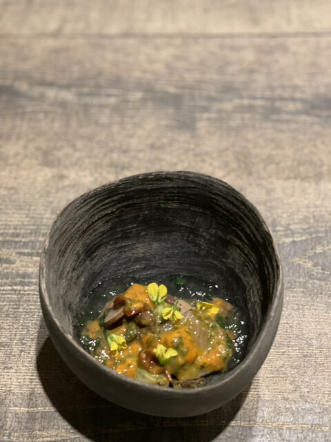 白エビとエビ煎餅 山羊のチーズグジェール 鳥レバームース 幻魚(ゲンゲ) 赤ビーツ