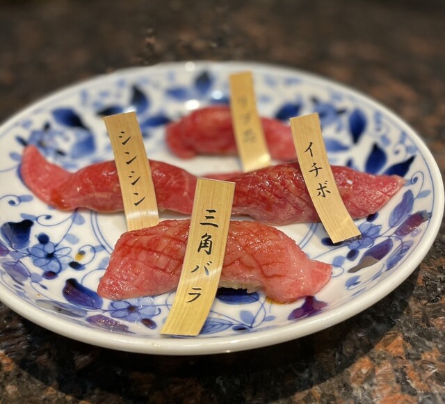 〈寿司〜4選シンシン・リブ芯・三角バラ・イチボ〉 と 〈牛茶漬け〉までしっかり楽しむことができました。