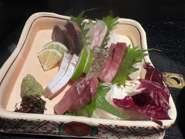 コース料理は付き出しの他に、サラダ刺身盛り、創作料理3品にパスタとデザート。