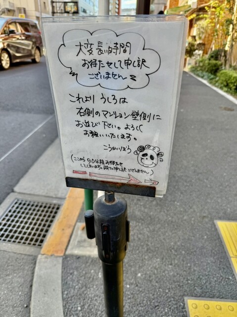 東京メトロ東西線/都営地下鉄大江戸線「門前仲町」駅6番出口から地上へ出る。永代通りに沿って左歩道を歩き、陽岳寺の角をふたたび左折。あとは一直線に深川方面に向けて歩き続ける。7,8分ほど歩くと、交差点の斜め向かい側に『こうかいぼう』が見えてくる。行列の絶えない店なので、並びの列で、すぐにソレとわかる。駅から歩いて10分弱。土曜の14時近く。行列の多さに一瞬たじろぐが、覚悟を決めて並ぶ。