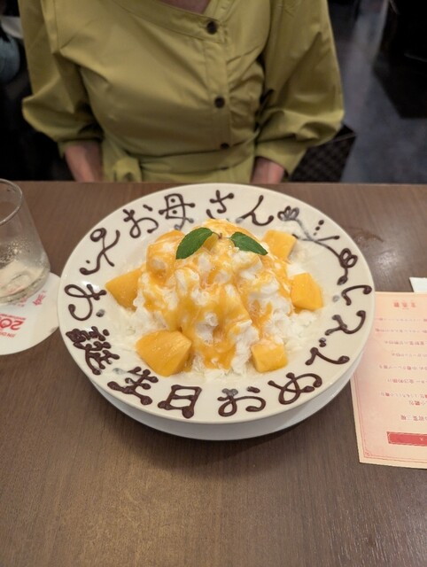 飲み放題にプレモル・香るエールが含まれていたので、お得感増し増し。暑い日には有難い。前菜3種盛りのクラゲの冷菜、美味しかったなぁ。小籠包も3種類。トウモロコシの小籠包、大好き!3個じゃ足りません(笑) 白身魚のフリッター、甘辛牛肉のクレープ包み、空心菜のガーリック炒めに大きな海老と野菜の甘酢炒め。どれも美味しい!〆は、フカヒレあんかけ炒飯。これも美味しくて、お腹いっぱい。小籠包が足らない、と言ったのは撤回です。デザートは杏仁豆腐と、事前に別オーダーしていたお誕生日用メッセージプレートのかき氷。かき氷と呼んでいいのか分からないくらい濃厚で甘くて美味しかった。