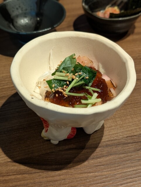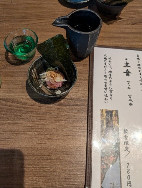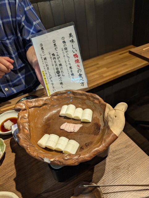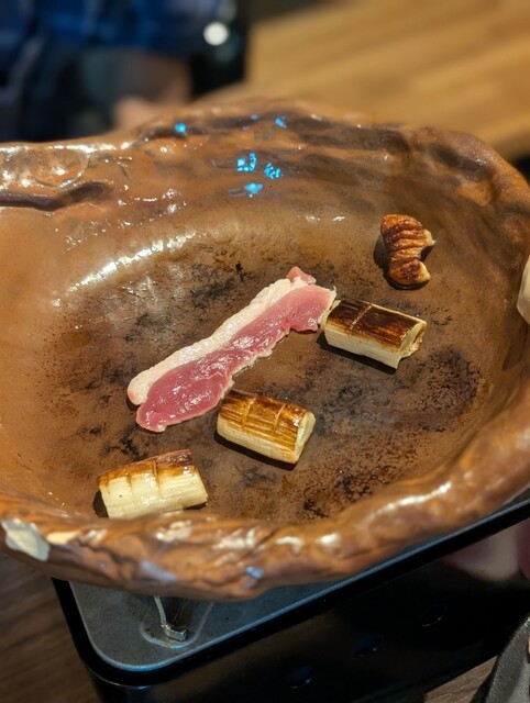 四ッ谷で会議があったので、食べログ検索。「秋は鴨肉」な気分になり、日本酒も豊富に取り揃えていそうなこちらのお店を事前予約。開店直後に入店。明るくて、清潔なお店に期待が膨らむ。一番奥の落ち着いた席に通される。まずは日本酒チェック! うん、色々あって楽しそう♪お値段も、地酒一合の中心価格帯が780円とリーズナブル。最初に目についたのが、限定酒の土音(つちのね)。調べてみると、等級がつかなかった「等外米」で醸したお酒とのこと。お猪口を選ばせてくれて、可愛い片口でサービング。いやぁ、とんでもなく美味しいお酒。素敵な吟醸香に、程よい甘味のスタートの後旨味が広がって美味しい。お通しの、トロたく&海苔との相性も最高。クラッカーに挟まれたくるみとレーズンのチーズ白味噌仕立て、とろける鴨皮ポン酢、青唐辛子の出汁巻きやら、なんやら美味しい肴で日本酒が止まらない。天吹 りんご酵母。フルーティな甘みと酸味で美味しい。宮寒梅 純米大吟醸。吟醸香が華やかで大好き。そして、いよいよ鴨焼き(2種)。二人では多いかなと思いつつ、ロース肉とモモ肉を食べ比べたくてオーダー。鴨脂とネギがのった陶器の鍋がコンロに乗って登場。程よく焦げ目がつくネギを見ているだけで垂涎もの。お肉は、両面各10秒ずつ焼いて、ネギをくるんで、たれにつけてパクリ。うま~~いっ! カモネギーホールで食の音楽会や~、とは恥ずかしくて言えなかったが、心の中で大絶賛。2種類のお肉は、まったく異なる味わいで、十二分に楽しめた。もぅねぇ、日本酒が止まりませんよ。最後は、白ラー油鴨つけそば(大盛り)と土音の再登場。