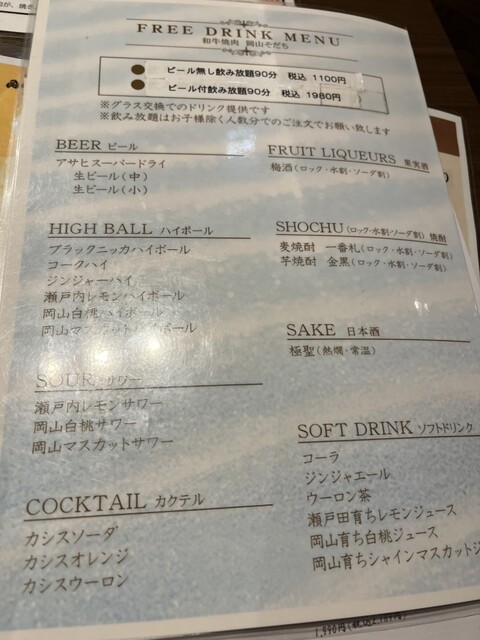 飲み放題も岡山産のカクテルあって嬉しいですね、焼肉屋ってお通し代かからないから下手な居酒屋行くよりコスパ良って思う。