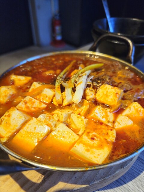 ピリっと辛いのがあとをひく。辛いけれど食べ進めたくなるすじ鍋です。