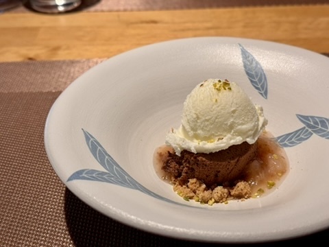 料理は地元の食材を中心に、季節感あふれるメニューが揃っています。特に印象的だったのは、地物野菜の盛り合わせと三重県産さくらポークのロースト。新鮮な野菜の彩りとポークの旨味が絶妙で、見た目も美しく感動しました。デザートには、ミルクジェラートが添えられたチョコレートムースをいただきましたが、これもまた絶品でした。