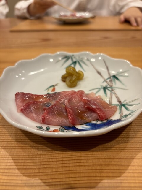 鯉のハラミ薄造り フキ 山椒のオイル