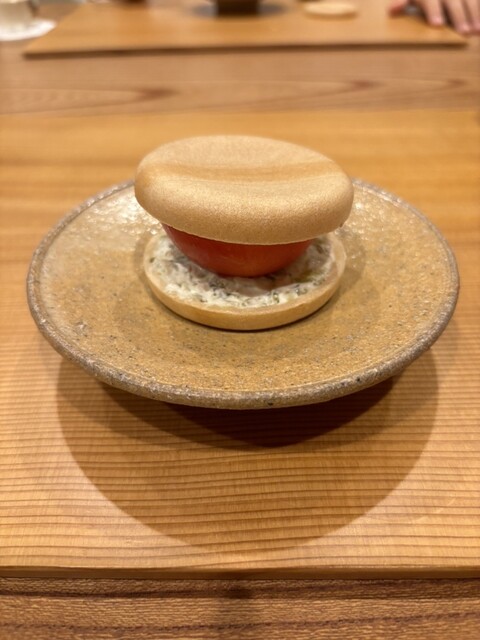 トマトの最中 甘酢に漬けた長野県安曇野のワサビとクリームチーズ ワサビをつけた甘酢のジュレ