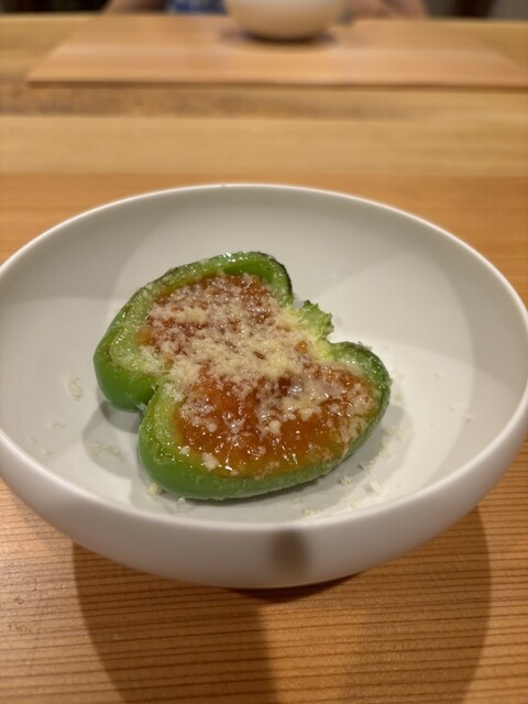 青いまま収穫されたパプリカに細かく刻んだ自家製らっきょ トマトピューレ バッカスチーズ