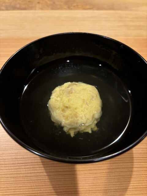 そら豆でつくったくずよせの食感が面白くて、そら豆のわたと皮でつくった吸い地と一緒にお口に入れるとお口の中でそら豆が完成。