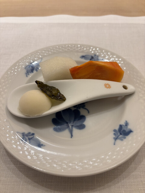 スターターの帆立と雲丹の揚げ餃子は、熱いので20秒待って一口でいただくのですが、口の中で帆立と雲丹の旨みが広がり、とても美味しかったです。