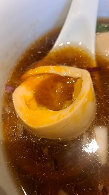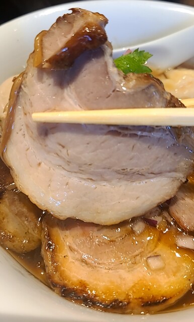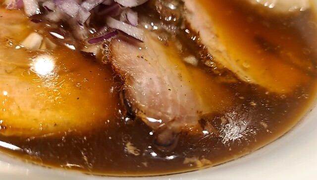 まず、臭覚的に、凄い地鶏の良い香り~また、視覚的には、濃口醤油のキレイなスープです~三葉のアクセントも良いですね!スープは、一口飲んだら…うまぁぁぁぁぁぁぁ!なんて芳醇な優しいスープ、ちょい甘めの口当たりの良い返しで、地鶏の出汁とのバランスが素晴らしい 返しと出汁の双方が実に濃厚で、バランスが取れているのです そこに、炙りチャーシューの香ばしさが、スープに移ってきており、芳醇な醤油と地鶏の旨みだけでも充分に旨いのに、ここから更に、炙りチャーシューから垂れ出している、脂の香ばしさがスープに加わるという、とても美味しいスープです!さすが名店! 麺は、低加水とまでではないですが、若干加水させた細ストレート麺で、スープの上がりと、モチモチ感を両立させているように感じます チャーシューは、低温調理ではなく、炙りチャーシューで、実に味わい深く、香ばしい 部位によって、柔らかいところと、固めのところがありました。これが、このスープの名脇役とも言えます 刻みタマネギもまたあいますね~ワンタンは、エビと肉が1つづつ入っています 具の中身は小さいですが、味は間違いないものでした さすがラーメンの巨匠佐野実師匠のDNAを受け継ぐ名店、らぁ麺嶋 語られる実績は、偽りなし、文句なしの美味しいラーメンでした!是非オススメしますね~