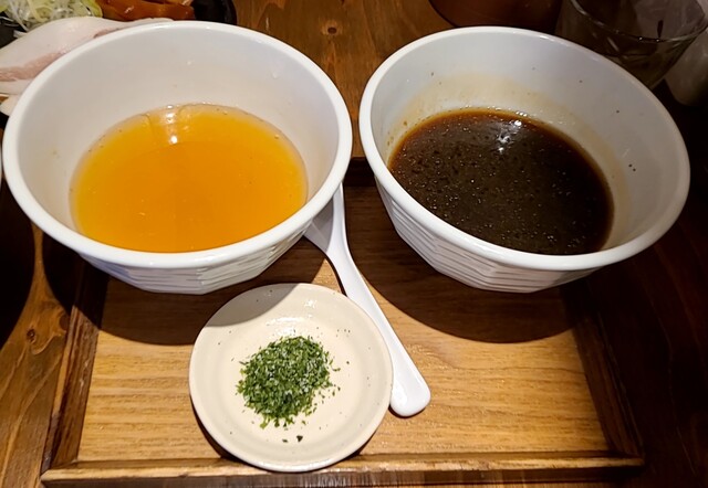 ここのつけ汁は、塩と醤油のチョイスに6種類の油から味を選べます