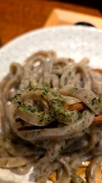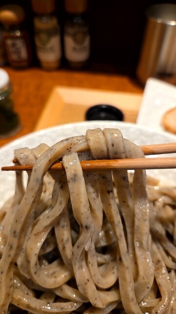 麺に練ってあるゴマでしょうか つけ汁と小麦の強さにどうしても勝てないので、食べていてあまり感じにくいですが、それでも全然納得できる美味しさと、クオリティーに見合わない安いお値段、オーナーさんの元気の良い笑顔でのご挨拶 全てにおいて頂点ですね~♪