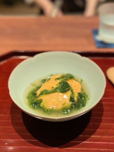 ①伊勢海老(三重県産)身&味噌のワンタン、縮み法蓮草の金華ハムスープ、うるい添え