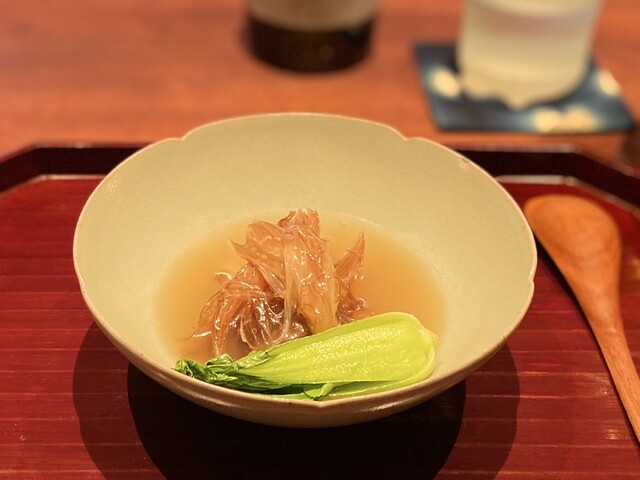④真鱶鮫(まぶかさめ、正式名:鼠鮫、宮城県気仙沼産)の尾鰭の鱶鰭、漢方スープ(棗&蓮の実&枸杞の実など)、もやし&黄韮&青梗菜添え