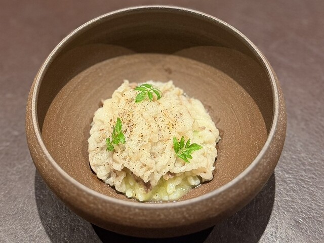 リゾットはお米の粒が大きかったので最初は龍の瞳かな?と思ったら、イタリア米とのこと。細部にまでイタリアンの要素にこだわる精神が素敵。お米の粒感がしっかり感じられるお皿。その上の熊肉も美味しかった。