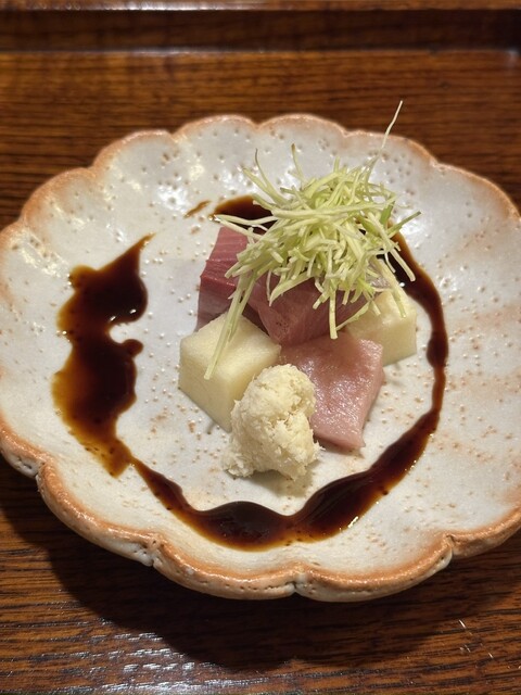 お店は古民家で中庭もある京都らしい素敵な雰囲気です。席はカウンターのみで大将のホスピタリティ溢れる接客で楽しい食事会になりました。