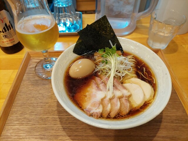 つけ麺もとてもひかれましたが、気温が低いので、身体が温まるラーメンでしょう、と思い、特製醤油1250円を注文しました。そして、それとは矛盾するのですが、小ビールも頼んでしまいました(笑)