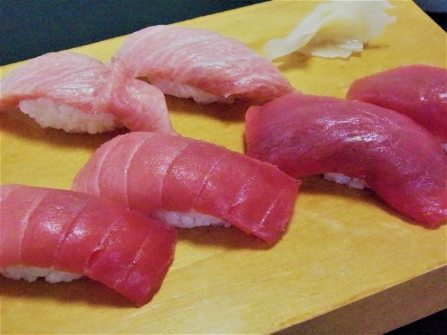 すし徳さんの「マグロ尽くし」は、赤身・中トロ・大トロがセットになったもの。