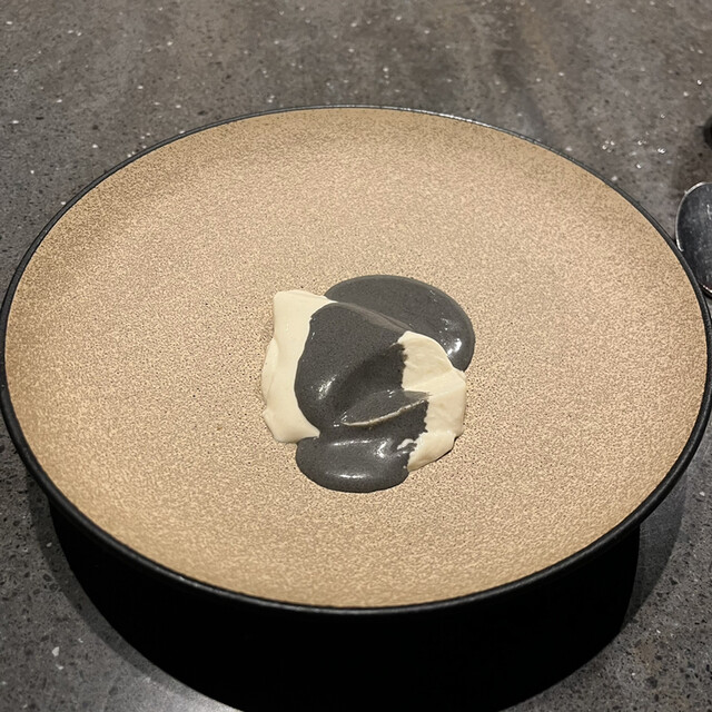 →白いのにコーヒー味なブランマンジェに濃厚な黒胡麻のソースが合う!和洋折衷なデザート