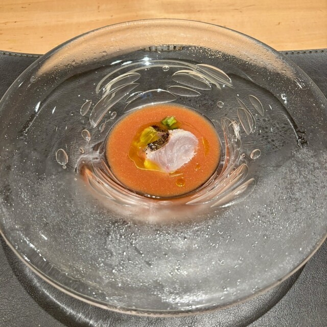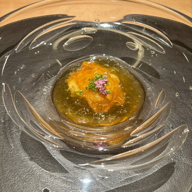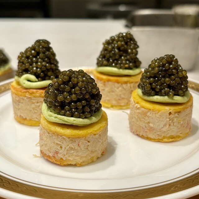 上品な甘さでジューシーな毛蟹、脂が無い分アボカドでプラスされたコクとまろやかさ、キャビアの塩気と燻香、グジェールのチーズ感が口の中いっぱいに混ざり合う最高の一口!