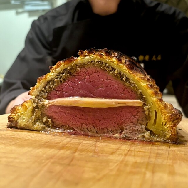 →松坂牛ヒレの塊肉にエシャロットとマッシュルームのデュクセルをたっぷりと被せ、パイで包んだ新メニュー