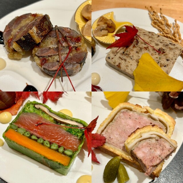 (茸ムース(舞茸/占地/太鼓のばち/正源寺茸/箒茸) 鶏のムース テリーヌ 新銀杏素揚)