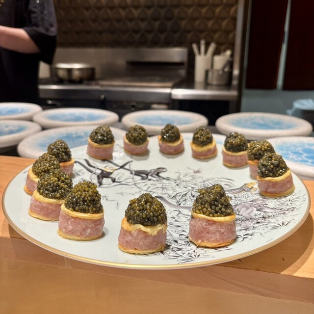 燻製キャビアの絶妙な塩気と燻製の香りが鰹の風味と共に口いっぱいに