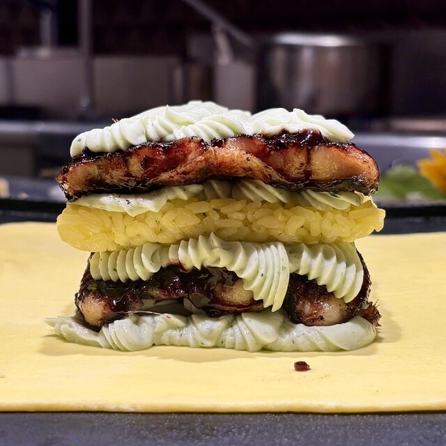 ○鰻パイ (真鯛と帆立と法蓮草のムース/サフランライス/根セロリ)