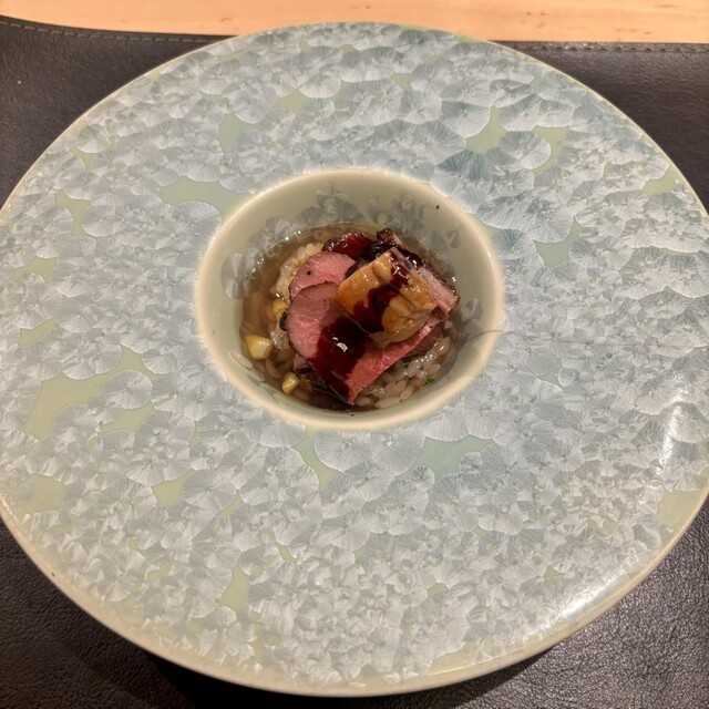 ○ハンガリー産フォアグラ 炭焼鴨 玉蜀黍と木の芽ご飯 (鴨コンソメスープ/赤ワインソース)