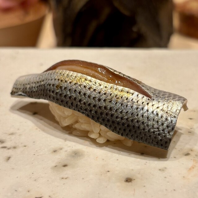 シャリとネタの間に仕込まれた浅葱の風味が力強い鯵の旨味と共にお口に広がる