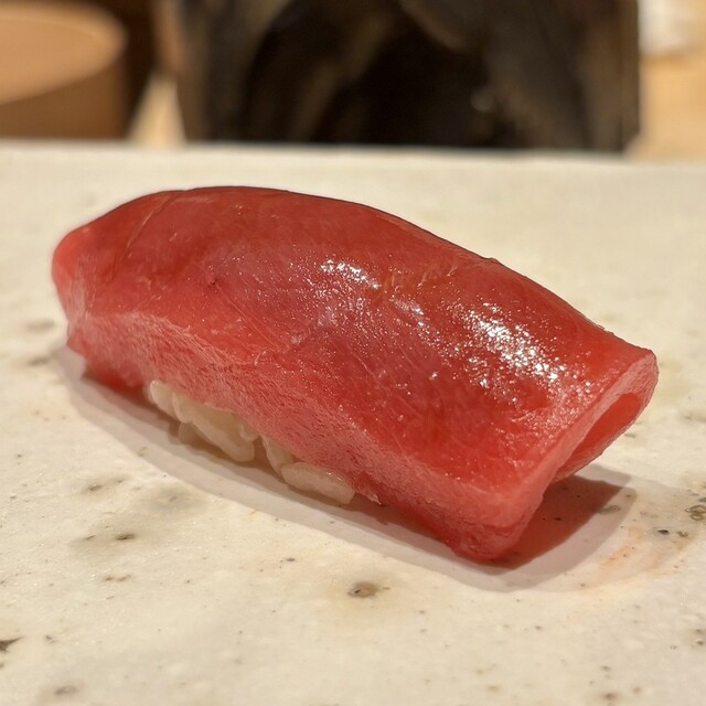 →始まりの一貫、まろやかな旨味と甘味が広がるとろける鮪にキリッとしたシャリ