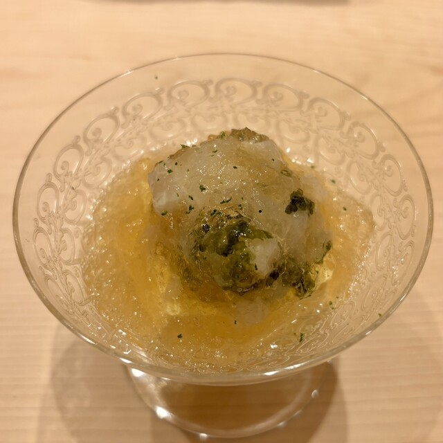 →ぷるんとした玉子豆腐にコロコロダイスカットの平貝、海ぶどうとプリッとした大粒の白海老をお出汁のジュレが包み込んだ夏にピッタリの涼やかで遊び心ある一品
