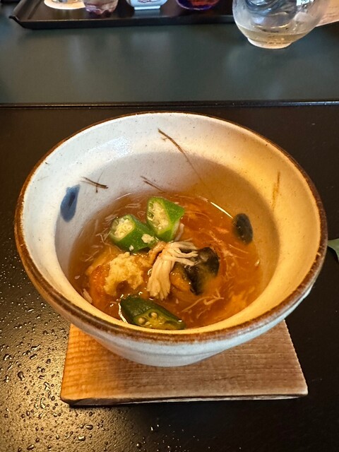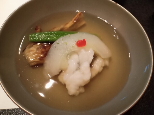 御椀は旬の鱧。くず粉を使ってとろみがつけてあり、焼き茄子とのバランスも最高。