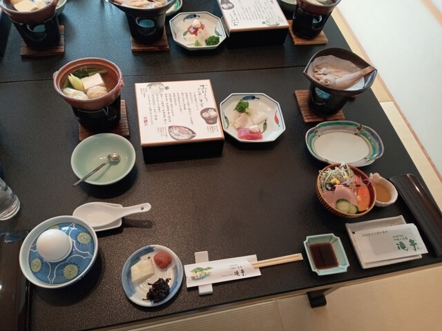 さてお待ちかねの夕食は別部屋の個室で頂きます。テーブルには夜の献立とともに、前菜が用意されています。既にワクワクも最高潮。