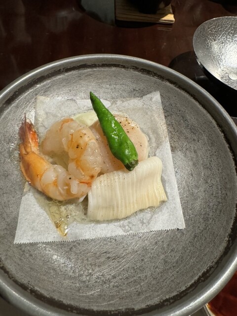 海鮮陶板焼き、新鮮なエビ、ホタテをさっと火を通し頂き、どちらも甘味抜群、プリプリでした。