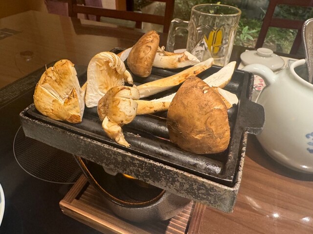 香ばしく焼かれた松茸からは、豊かな香りが立ち上り、食欲をそそります。一口食べると、外はパリっとしていて、中はジューシーな食感が広がります。その独特な風味は、松茸ならではのもので、まさに贅沢な味わいでした。
