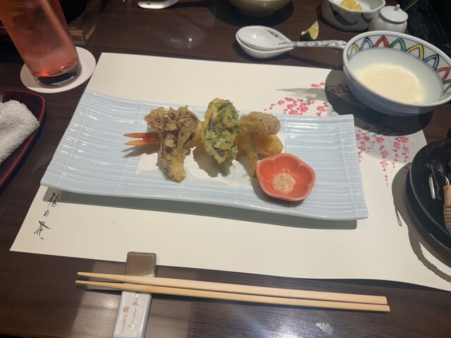 まず、松茸の香りが素晴らしいですね。揚げたての天ぷらから広がる芳醇な香りが、食欲をそそります。一口噛むと、外はサクサク、中はジューシーで、松茸特有の風味がしっかりと感じられます。口の中でふわっと広がる味わいが格別でした。