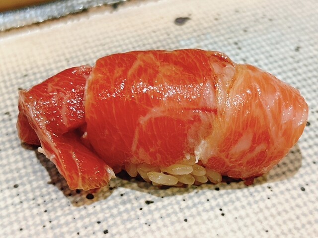 お鮨は10貫ほど頂きました。熟成されたお鮨が次から次へとやって来ました。ブリやトロの見た目はほぼ牛やポークのお肉のようで、脂が乗っていて、舌で溶けていく感じでした。