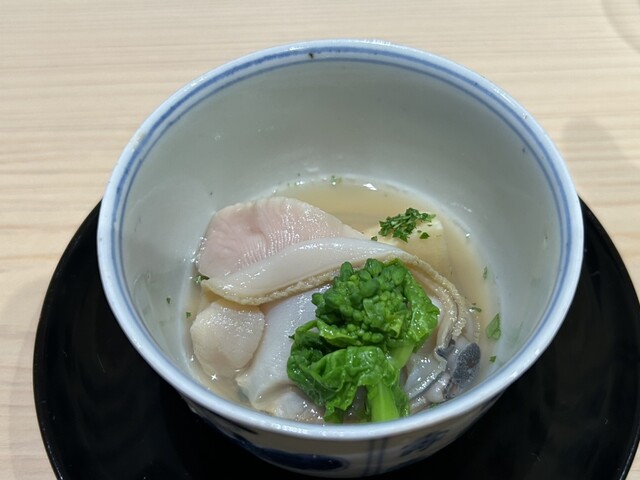 本日もカウンター6名、テーブル席2名で17時により一斉にスタートしました。つまみが6品ほど出ました。何度か頂いているアワビ&アワビ肝のムースは安定の旨さでした。一方クエを軽く茹でた一品は初めて頂きましたがこちらもとても美味しかったです。あとカラスミ料理も美味しかったです。